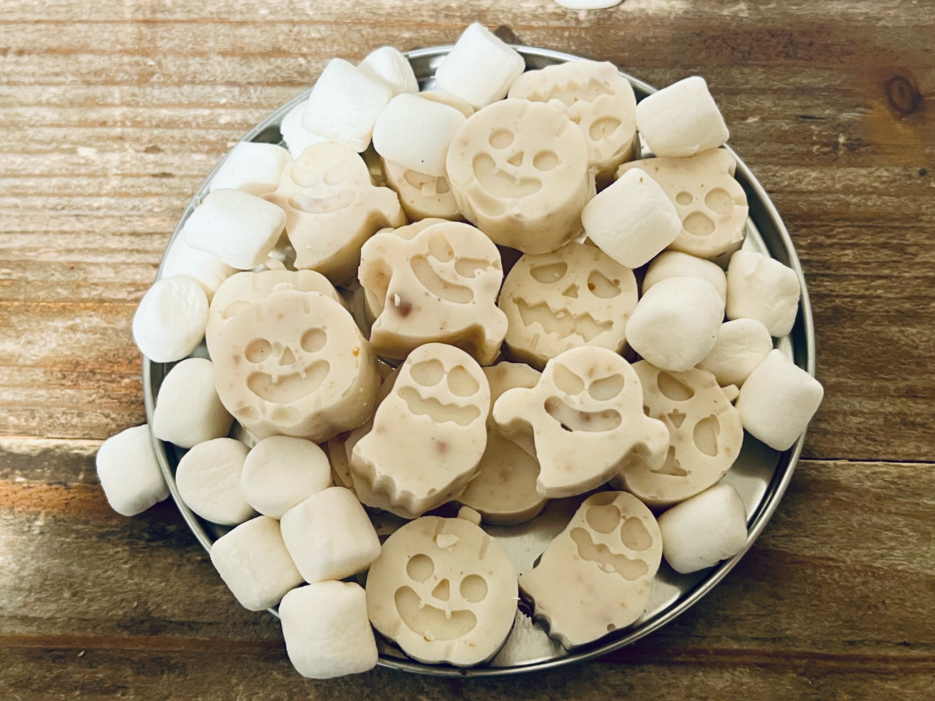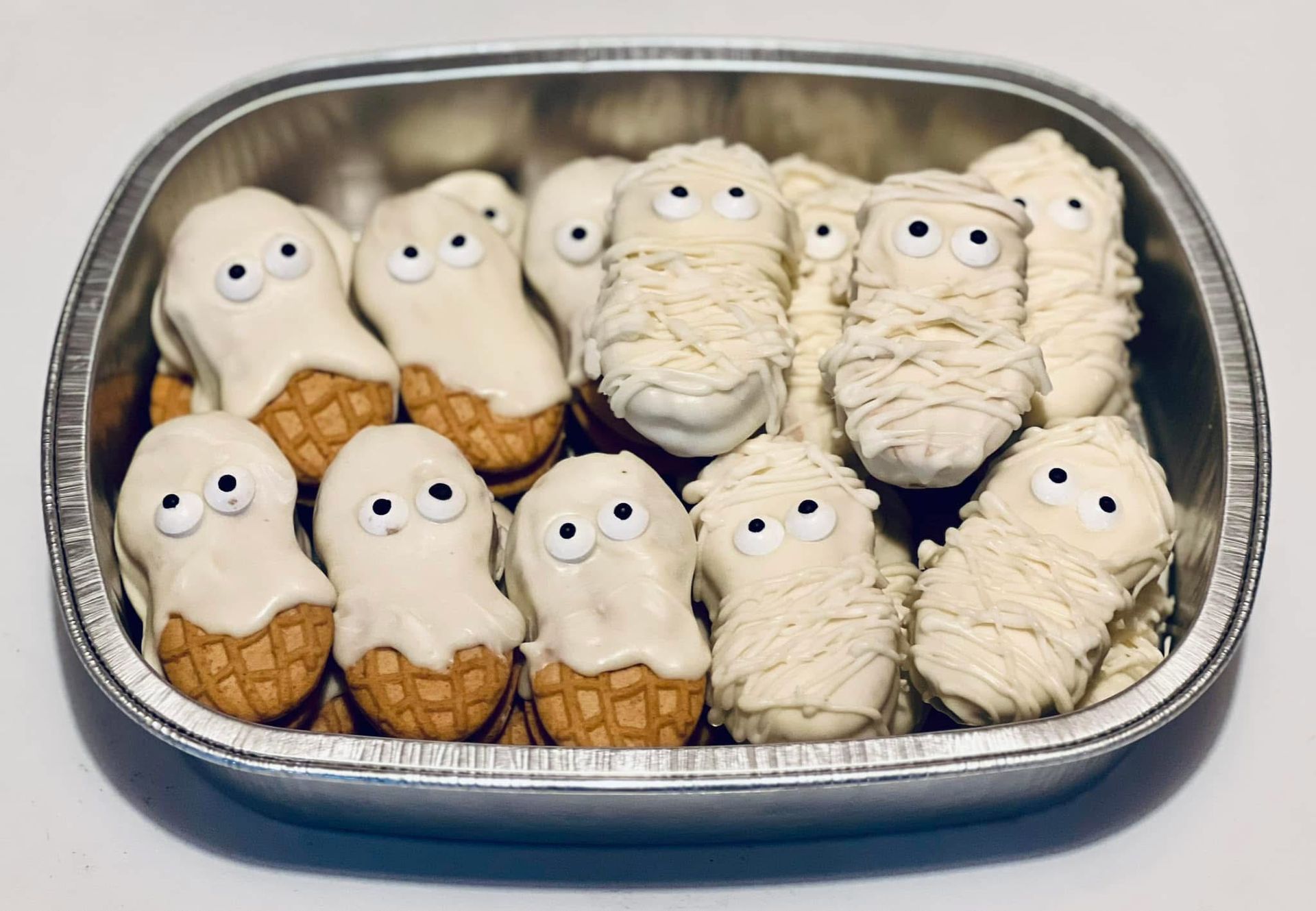 White chocolate–dipped Biscoff truffle ghosts and mummies with candy eyes. Soft, spiced centers that haunt your cravings.