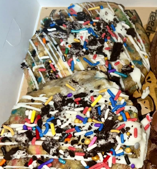 Birthday cake–style vanilla dough with Halloween sprinkles, crushed Halloween Oreos, and a birthday cake–flavored chocolate center.