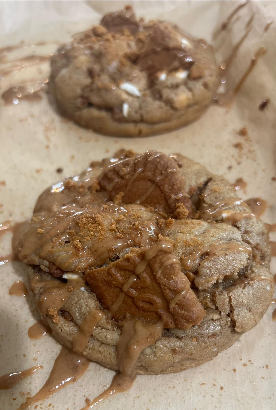 Soft brown sugar cookie stuffed with a molten Biscoff center, lightly spiced and buttery. Finished with crushed Biscoff and a gentle drizzle (optional).