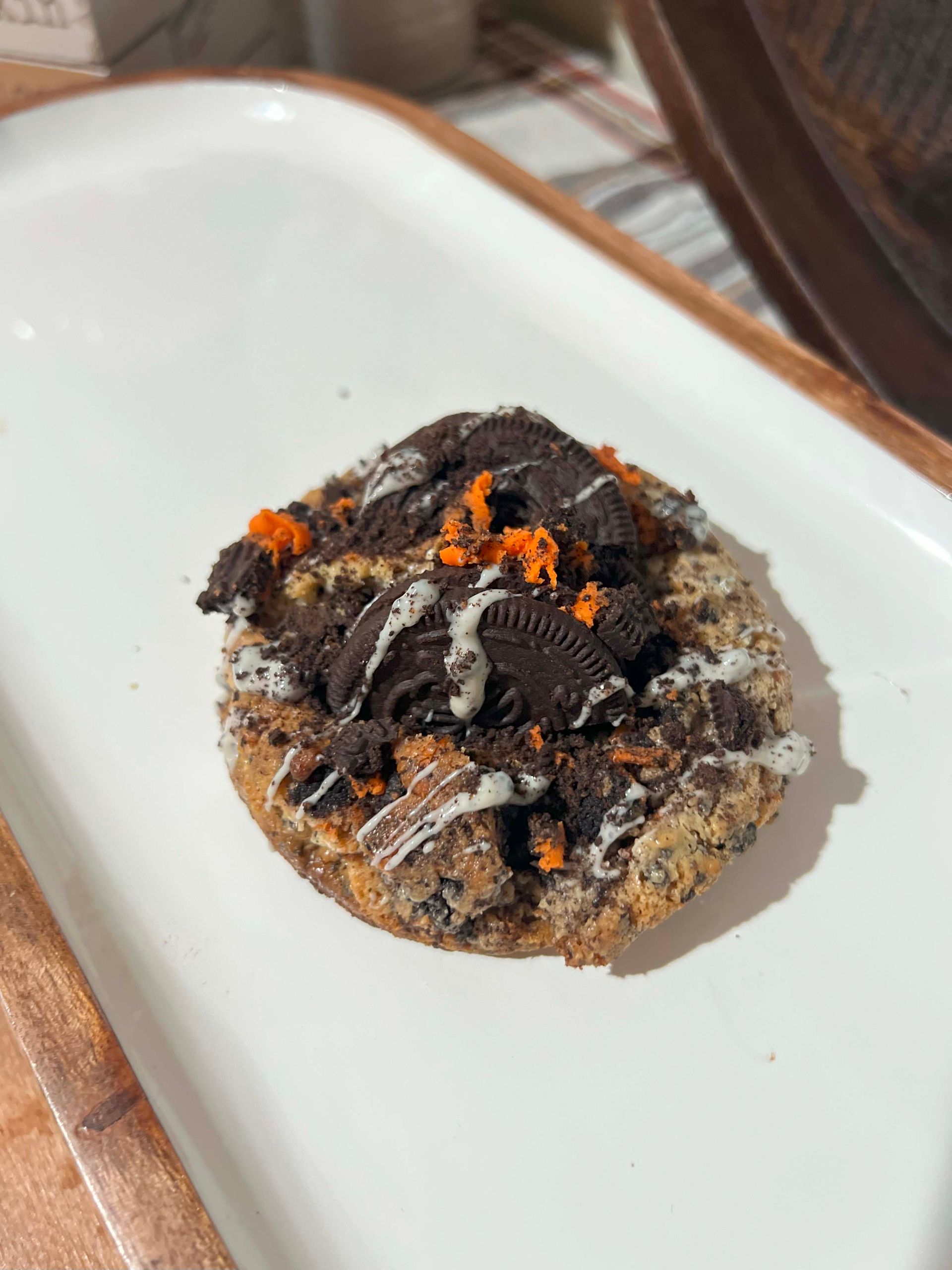 Classic vanilla-based Oreo cookie dough with crushed Halloween Oreos, finished with an orange-colored chocolate drizzle.