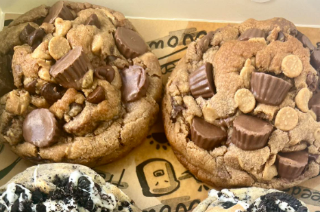 Peanut butter chocolate chip cookie base packed with chopped Reese’s cups and topped with a peanut butter drizzle.