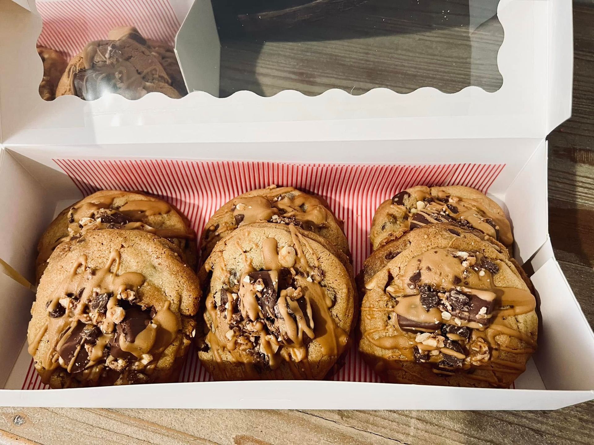 Soft peanut butter chip cookie base with caramel swirls, chopped peanuts, and a chocolate drizzle.