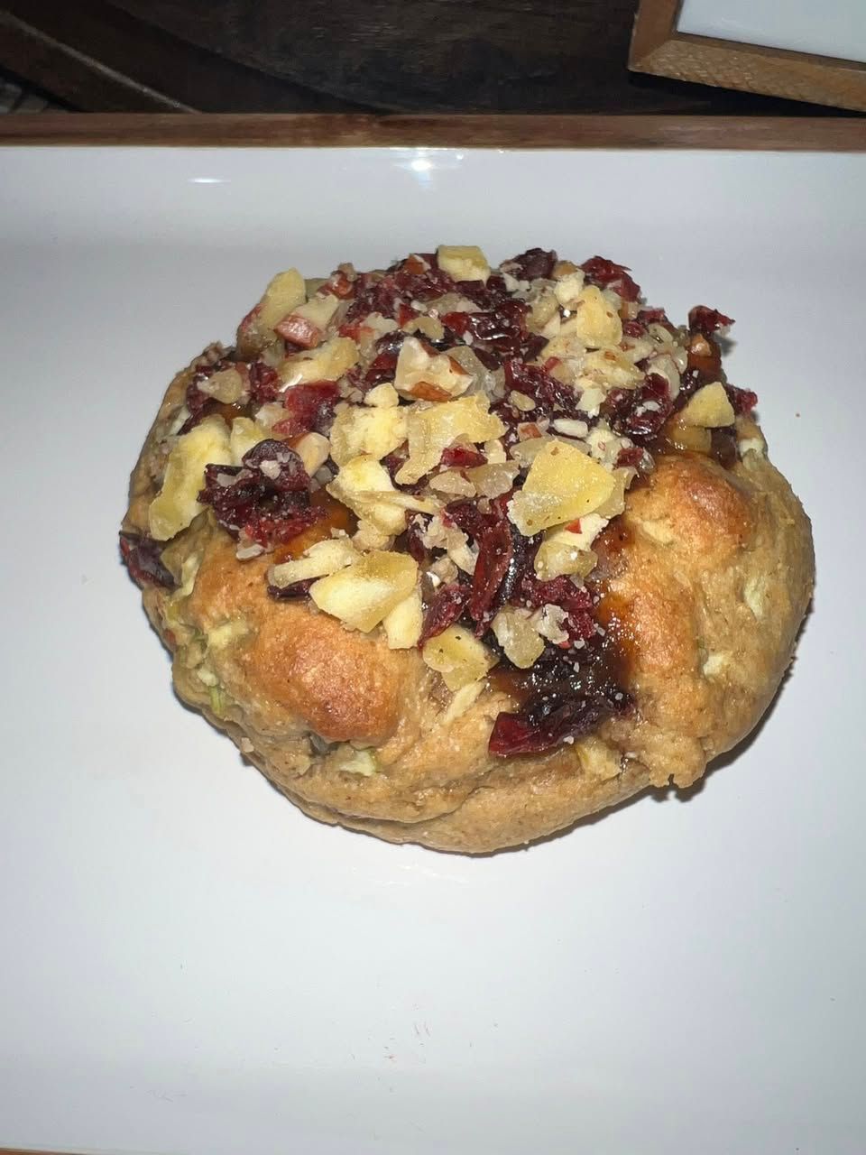 Cornbread-style dough with apple butter and maple folded in, plus chopped pecans and dried cranberries. Finished with a warm apple butter–maple–brown sugar drizzle and more cranberries + pecans on top.